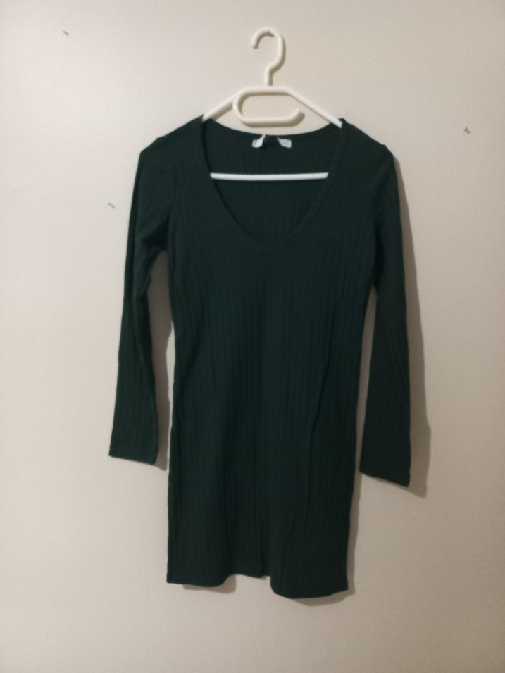 Yeşil, v yaka ve uzun kollu, düz renk tunik. Pamuk ve elastan kumaştan. Uzunluk 81,5 beden eni 35, kol boyu 57 cm.