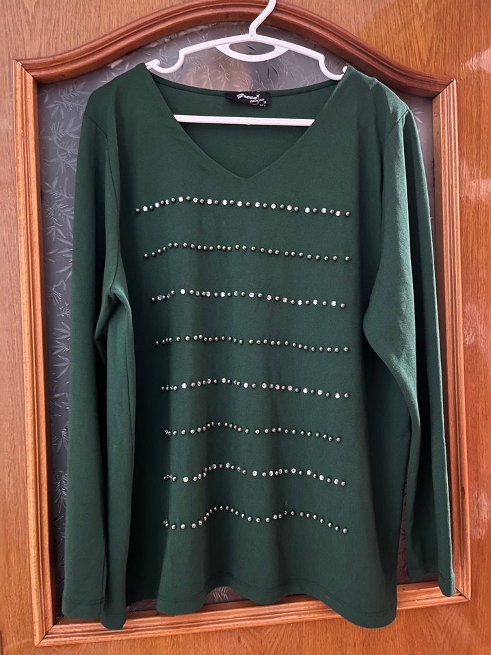 Yeşil renkli, V yakalı, uzun kollu ve bol kesim triko bluz. Üzerinde parlak payetlerle işlenmiş yatay çizgiler bulunur, rahat ve trend bir günlük stil sunar. ✨
