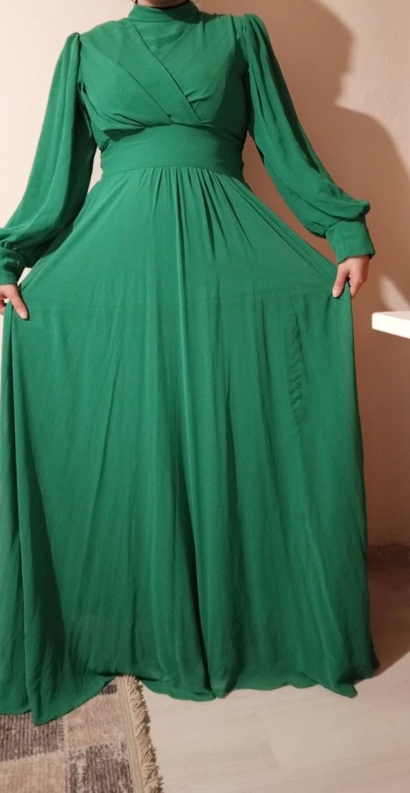 Koyu yeşil uzun elbise, bol kesim ve drapeli tasarıma sahiptir. Uzun kollu ve V yakalı, yumuşak sentetik kumaştan üretilmiştir. Klasik ve bohem tarzlara uygundur, düğün için idealdir.