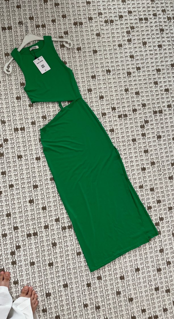 Yeşil renkte, bel dekolteli, uzun ve vücuda oturan kesimde, 130 cm marka temsilidir