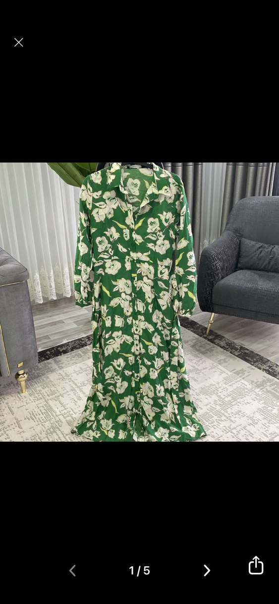 Uzun, yeşil ve V yakalı bu elbise bol kesim, uzun kollu ve drapeli bir tarza sahiptir. Bohem görünüm için bağlama desenli çiçek motifleri bulunur. Yumuşak sentetik kumaştan yapılmıştır, günlük kullanım için uygundur.