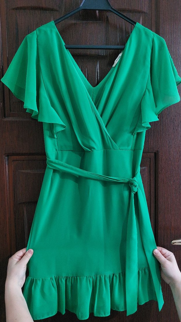 Yeşil midi elbise, V yaka ve drapeli tasarıma sahiptir. Askılı kolları ve beli bağlamalı, vücuda oturan kesimiyle sade bohem tarzda günlük kullanıma uygundur.