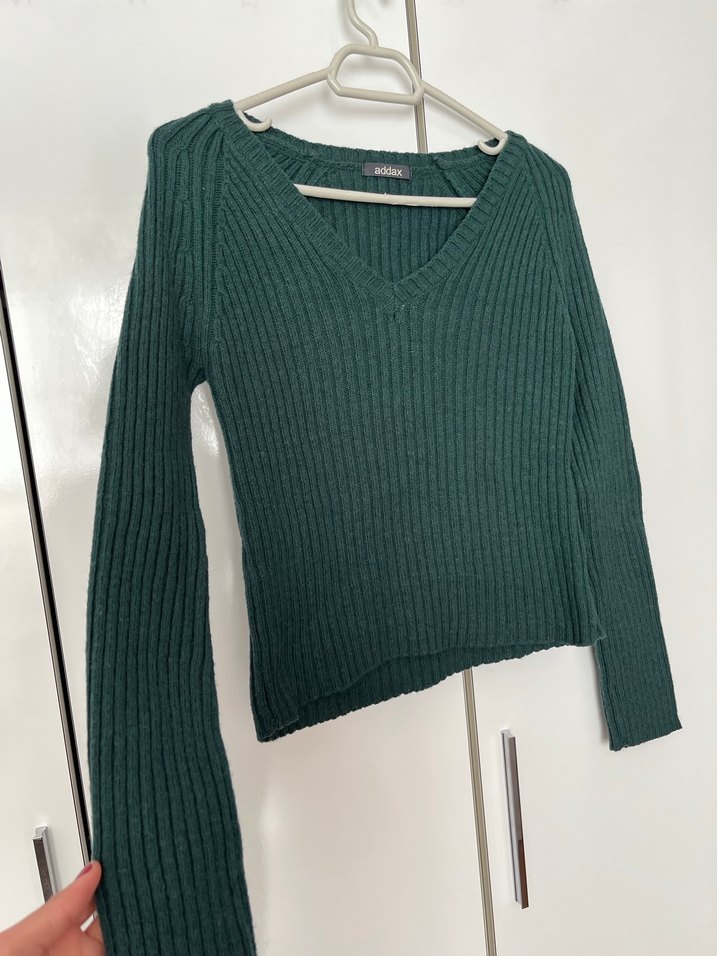 Yeşil V Yakalı Fitilli Triko Kazak
