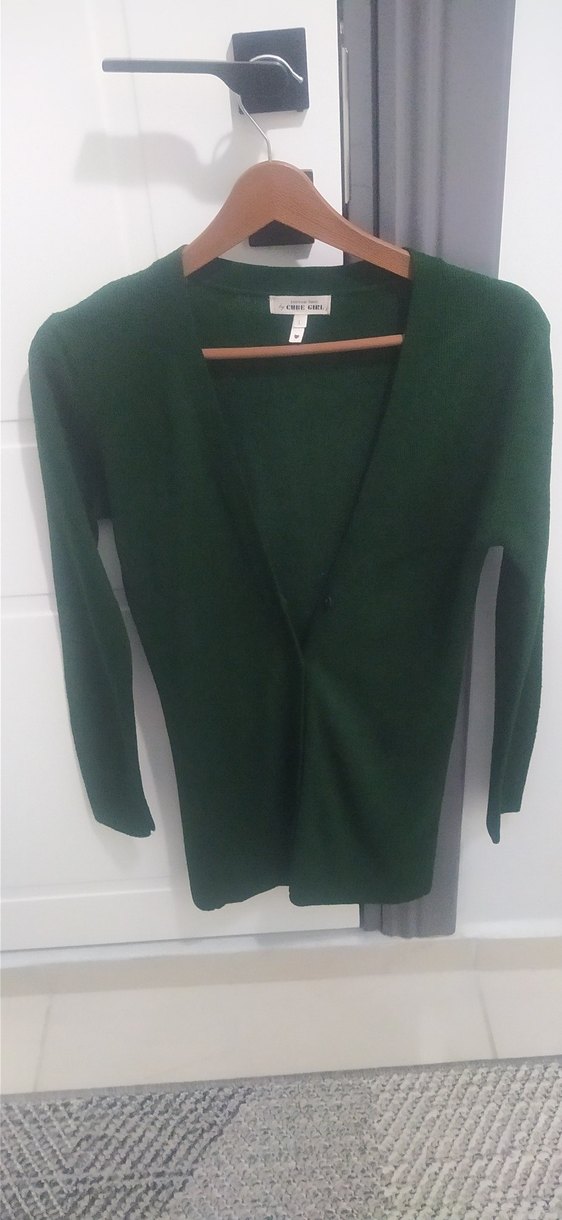 Koyu yeşil renkte, uzun kollu ve V yakalı kadın yün hırka. İnce kesimi ve sade tasarımıyla günlük kullanıma uygundur.