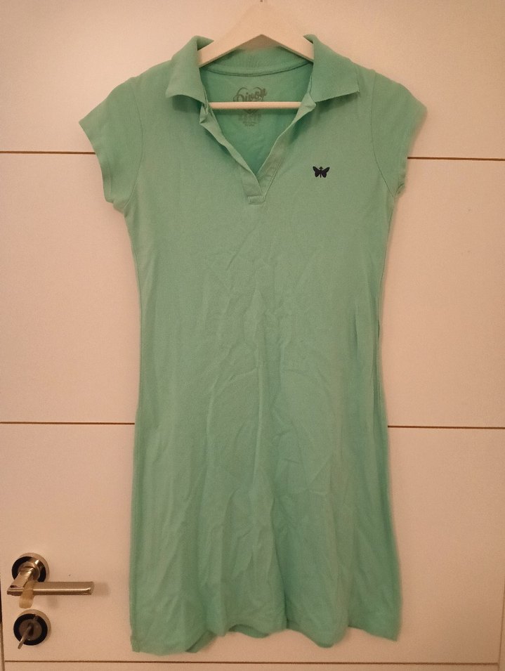 Pamuk kumaştan yapılmış, V yakalı, kısa kollu ve pastel yeşil renkte fitted kesim polo elbise. Streetwear tarzında, zahmetsiz şıklık sunar.