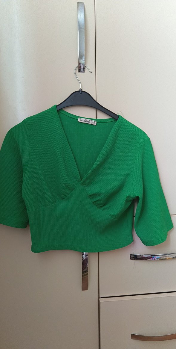 Yeşil tonlarında, V yakalı, kısa kollu ve kısa kesim triko bluz. İnce dokusu ve rahat kesimiyle günlük sokak stiline uygundur.