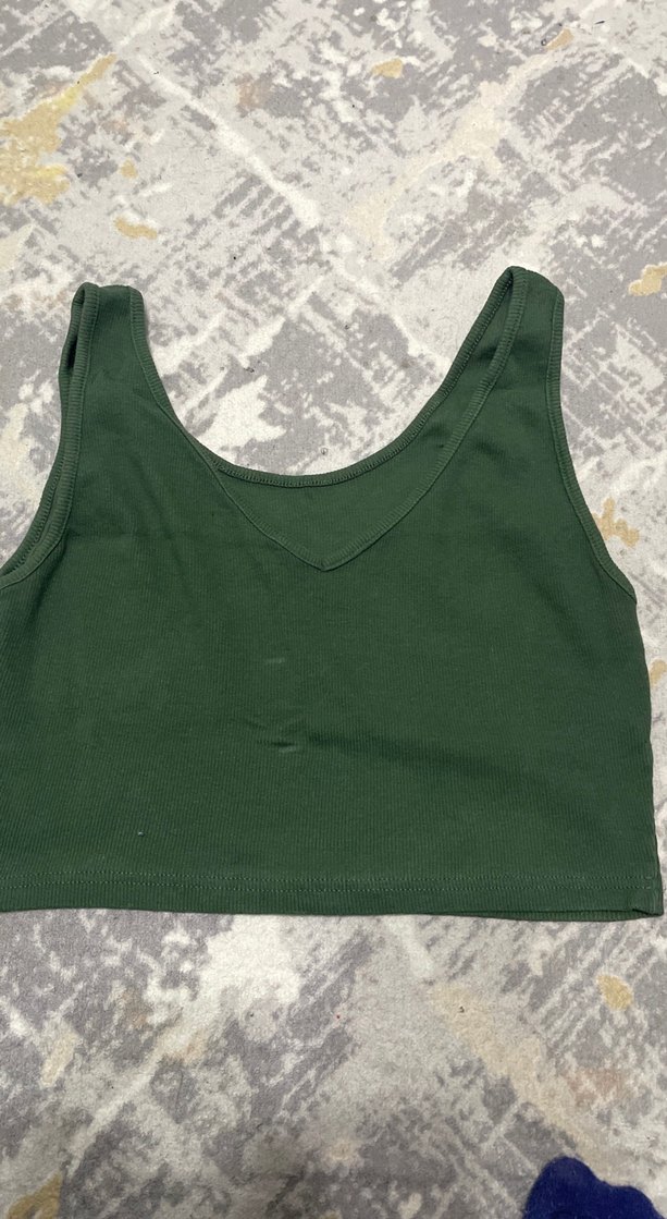 Yeşil, V yakalı, kolsuz crop top, yumuşak sentetik kumaştan, dış mekan sokak stiline uygun, vücuda oturan kesim.