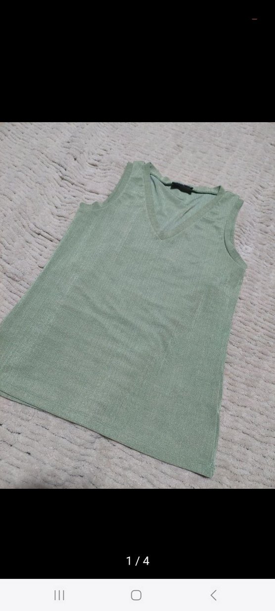 yeşil renkte, V yakalı ve kolsuz yapılmış, rahat kesimli kadın atlet. Günlük sokak stiline uygun, hafif ve şık.