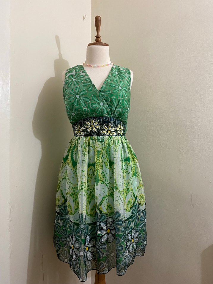 V yaka, kemerli ve renkli yeşil batik desenli, normal boy midi bohem elbise. Kolsuz ve vücuda oturan kesimi ile düğünler için uygun. Önünde küçük bir defosu var ama belli olmuyor. M bedendir. Alana hayırlı olsun.✨