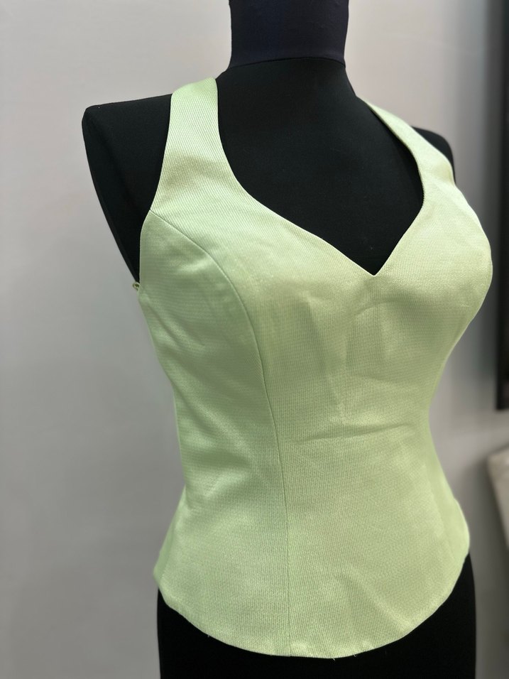 V yakalı, yeşil pastel renkli, sentetik kumaştan yapılmış, kolsuz ve vücuda oturan midi uzunlukta büstiyer. Minimalist ve çağdaş tarzda.