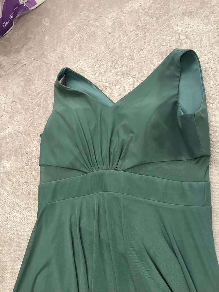 V yakalı, kolsuz, drapeli yeşil midi elbise. Fitted kesimi ve sade tasarımıyla düğünler için uygun, bohem tarzda. Sadece istememde giydim ve birdaha asla kullanmadım