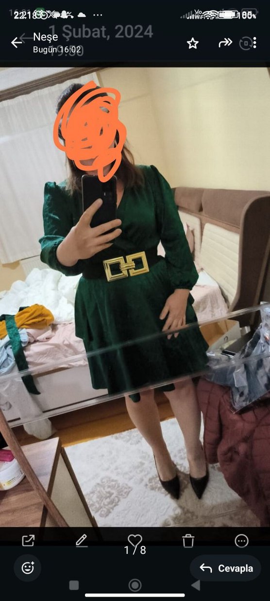 Koyu yeşil süet kumaştan, yılan desenli, V yakalı, askılı kollu ve kemerli, oturan midi elbise. Romantik akşamlar için uygun. kemer haric giyen k8si 80 kiloya yakin bel lastik