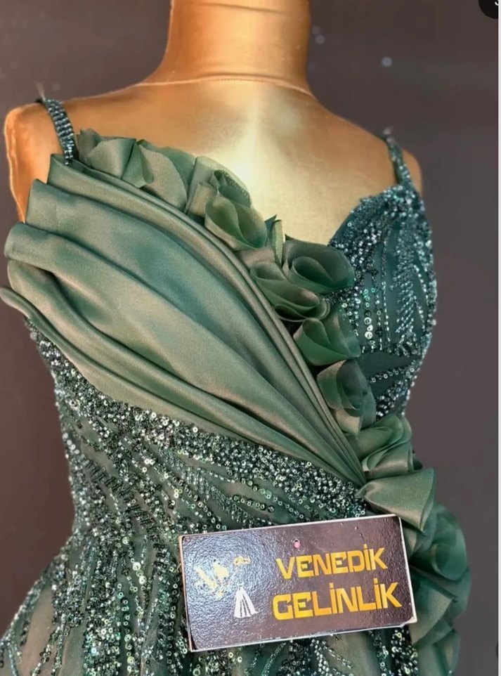 Yeşil, V yakalı, dökümlü detaylı, parlak desenli uzun abiye elbise. Kolsuz ve regular fit kesimle şık ve modern klasik tarzda parti elbisesi. ✨