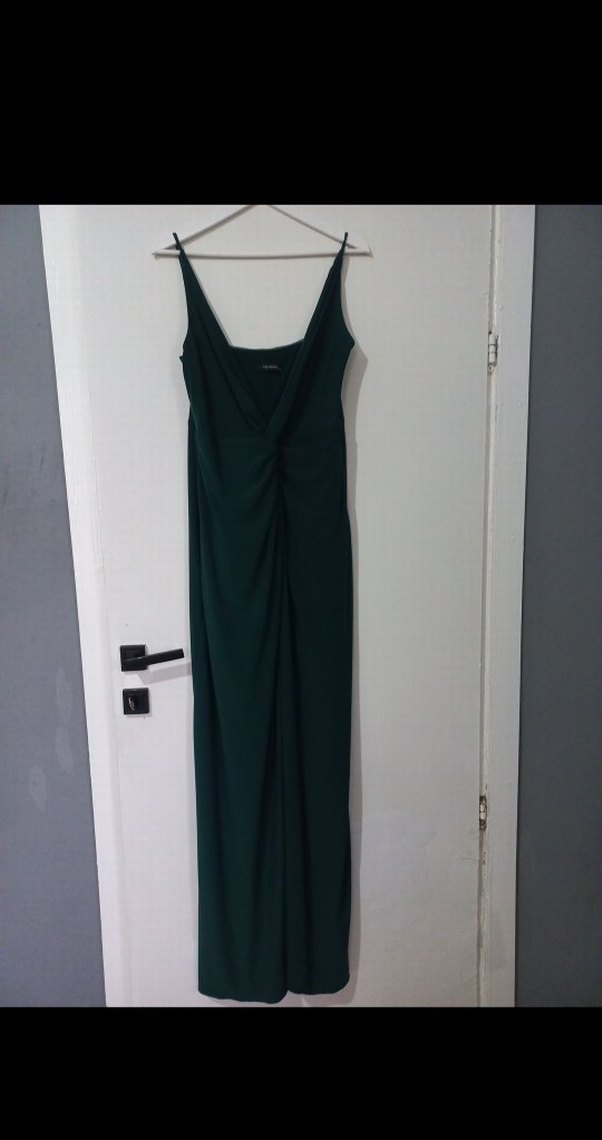 Kolsuz, v yakalı ve drapeli tasarıma sahip yeşil uzun elbise. Modern klasik ve minimal tarzıyla romantik akşamlar için ideal.