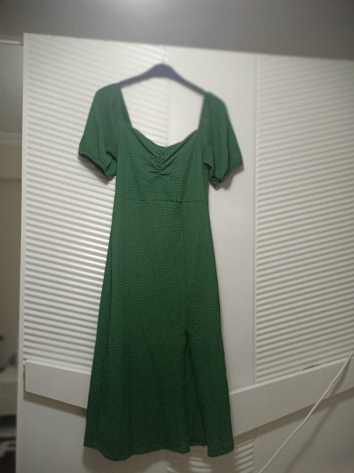 V yakalı, kısa kollu, drapeli detaylı yeşil uzun elbise, düz ve ince dokulu sentetik kumaştan, minimalist sokak stili için uygun.