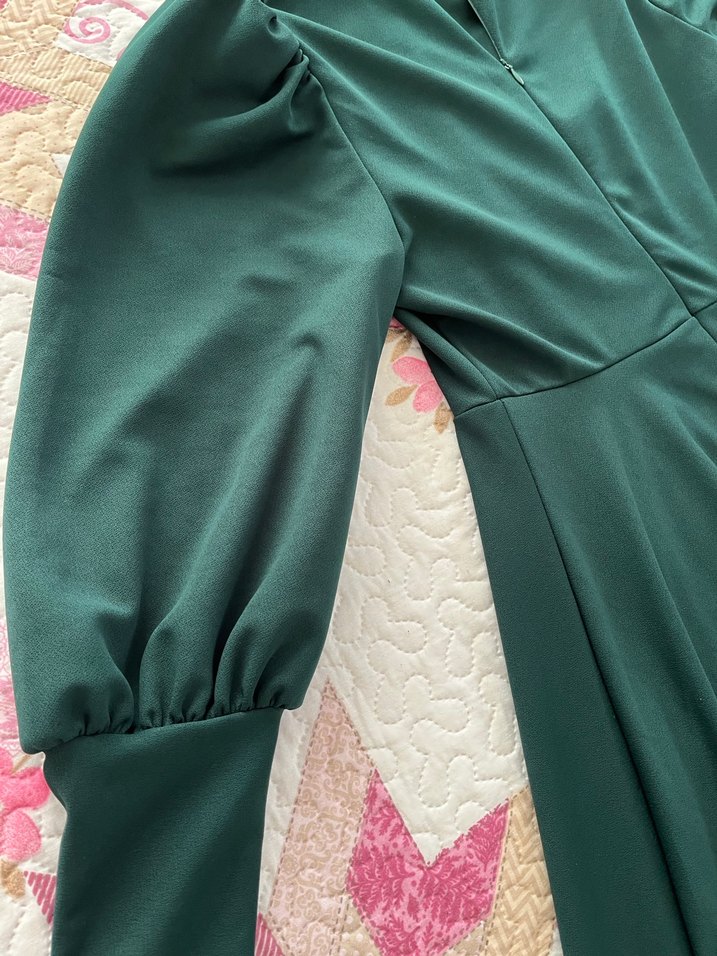 V yakalı, fermuarlı yeşil uzun elbise, uzun kollu ve vücuda oturan kesimdedir. Pürüzsüz sentetik kumaştan, klasik vintage tarzında ve ofis için uygundur. Tesettürlü elbise