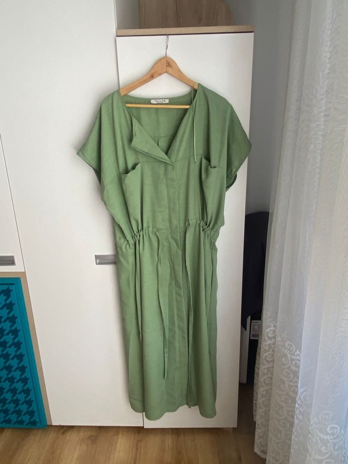 Uzun, bol kesim keten elbise, V yaka ve kısa kollu drapeli tasarıma sahiptir. Pastel yeşil renkte, minimalist tarzda günlük kullanım için uygundur.
