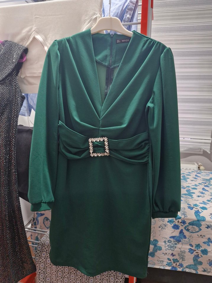 Yeşil, V yakalı ve kemerli bel detaylı uzun kollu elbise, parlak dokusu ve oturan kesimiyle klasik şıklık sunar.