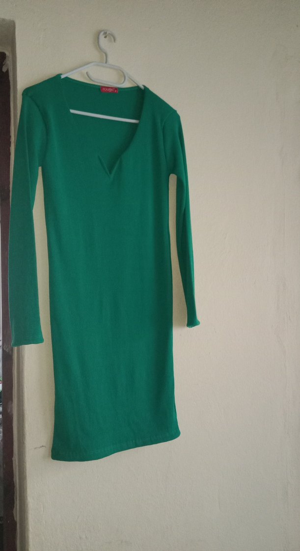 V yakalı, uzun kollu, yeşil triko elbise. İnce kesimi ve drapeli detaylarıyla, ipeksi dokusu ve parlak görünümüyle günlük kullanıma uygundur.