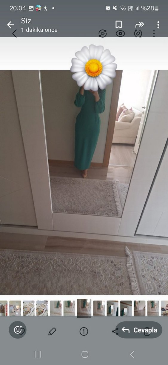 Yeşil renkte, V yakalı ve uzun kollu, ince oturan uzun elbise. Yırtmaç detayı bulunur, sade ve modern tarzda, ofis için uygundur.
