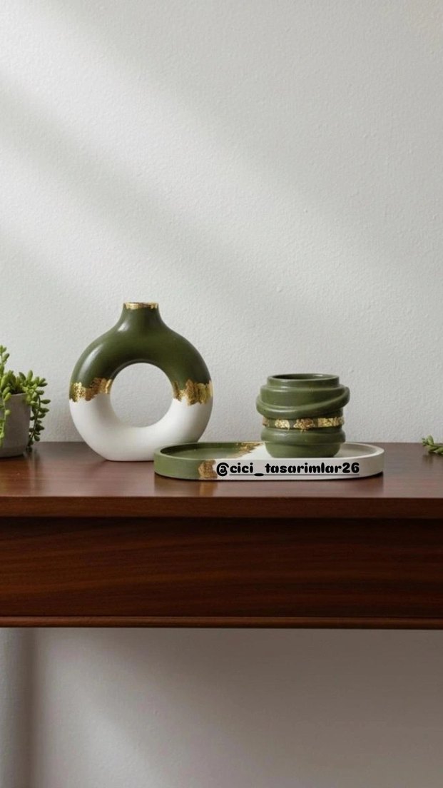 Altın detaylı yeşil ve beyaz renklerde, modern tasarımlı vazo seti. Yuvarlak ve silindirik vazolar ile tepsi içerir.