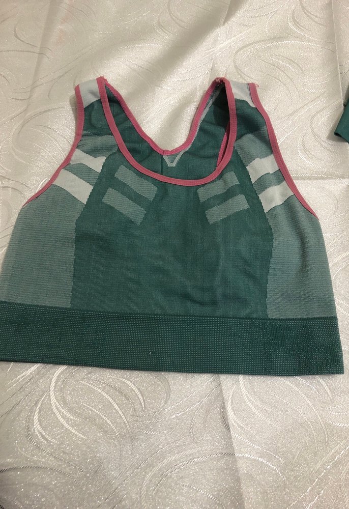 Pembe detaylı yeşil ve gri spor sütyeni, rahat destek sağlayan dikişsiz tasarıma sahiptir. ️♀️