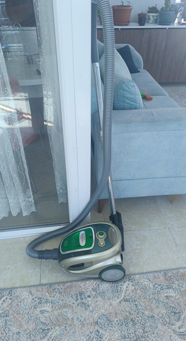 Esnek hortumlu, tekerlekli yeşil ve gri toz torbalı elektrikli süpürge. Kolay hareket ve etkili temizlik sağlar.