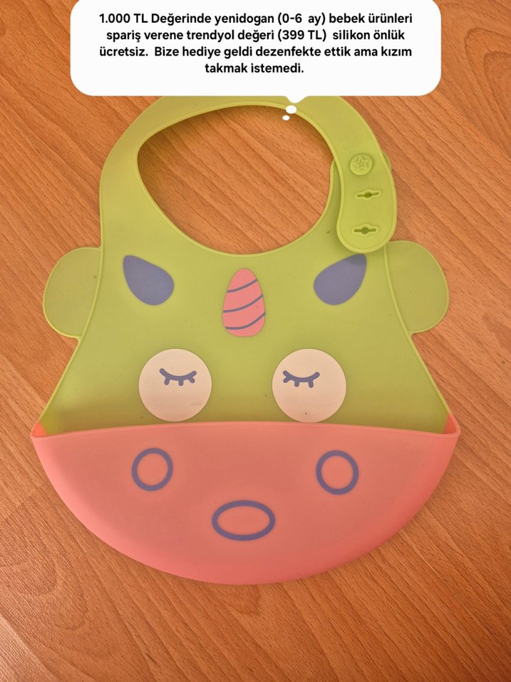 Pastel yeşil ve pembe renklerde baskılı silikon bebek önlüğü. Yumuşak, su geçirmez ve kolay temizlenir. Ayarlanabilir boyun kayışı ile rahat kullanım sağlar.