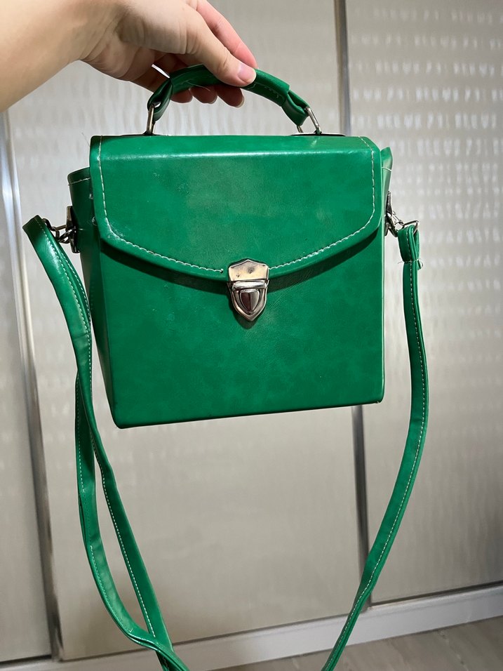 Parlak yeşil deri, tokalı kapama ve elde taşımaya uygun saplı vintage tarzı kadın çantası.
