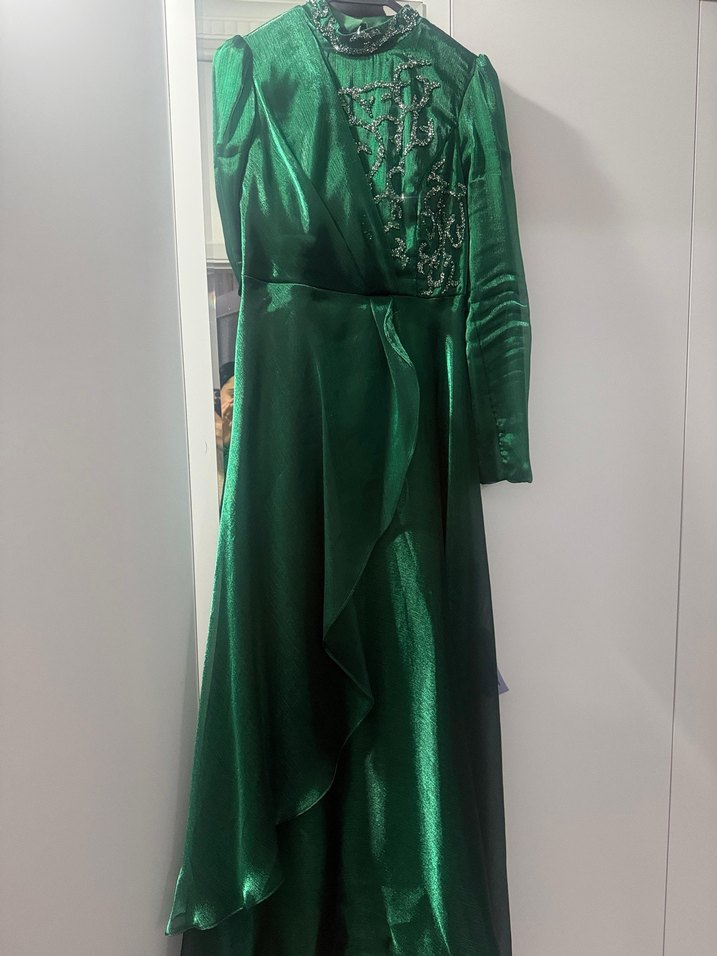 Parlak yeşil uzun abiye elbise, yüksek yakalı ve uzun kolludur. İşlemeli detayları ve drapeli tasarımıyla klasik zarafeti yansıtır, düğün için uygundur.
