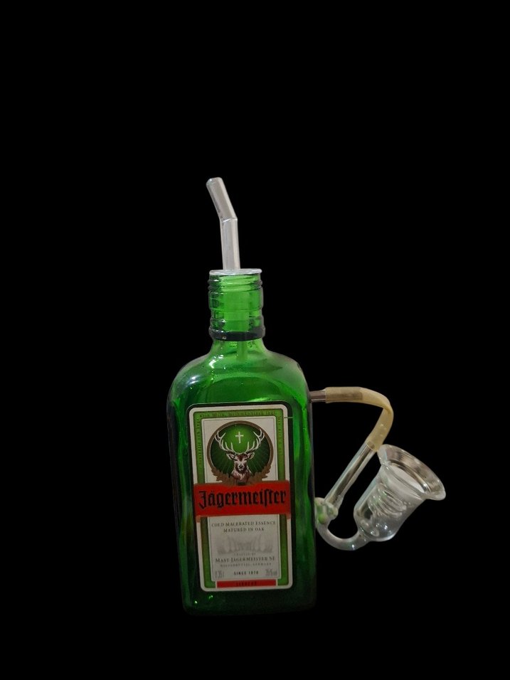 Yeşil vintage Jagermeister şişesi, renkli ve karşı kültür tarzında benzersiz cam aparatıyla dikkat çekiyor.