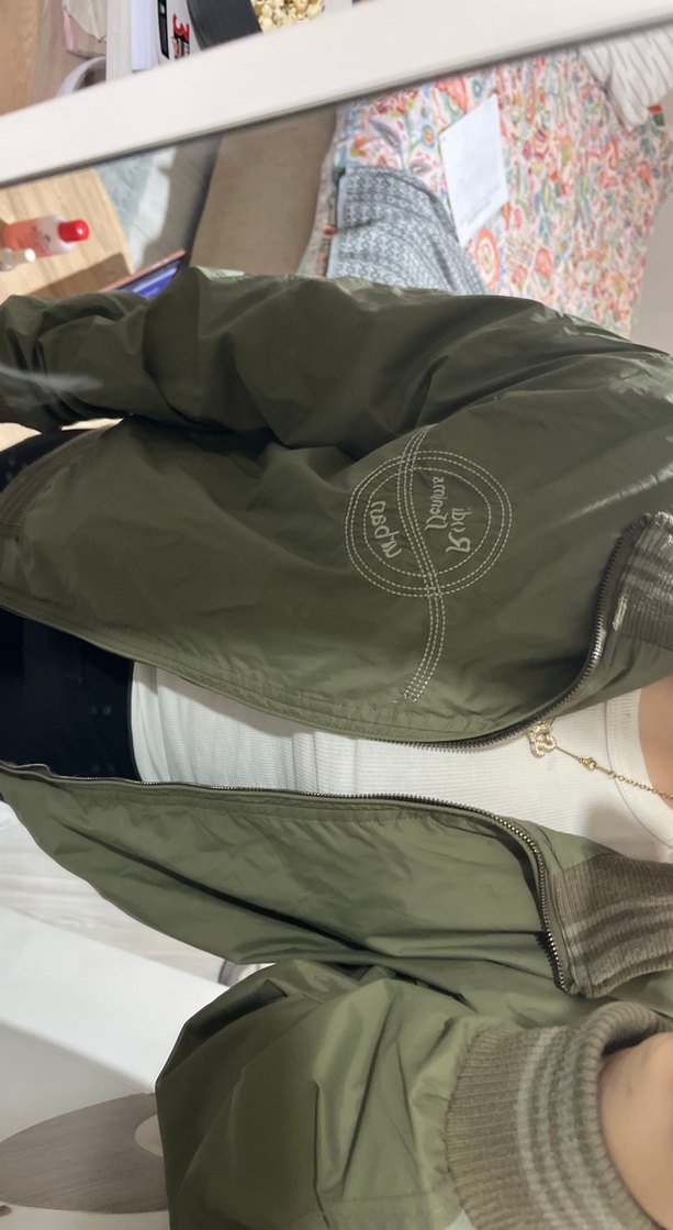 Parlak yeşil renkte, fermuarlı ve baskılı desenli, uzun kollu, bol kesim kadın ceket. Salaş ve günlük kullanıma uygun.
