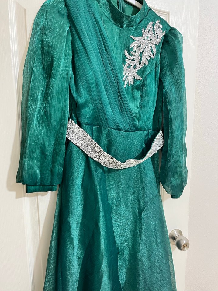 Parlak yeşil kumaştan, drapeli ve işlemeli detaylara sahip uzun, yüksek yakalı, uzun kollu ve vücuda oturan vintage elbise. Düğünler için uygun.