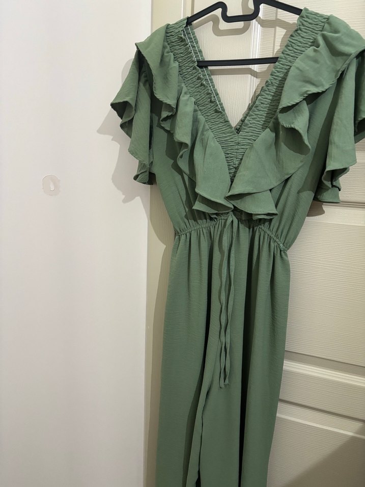 Yeşil renkte, V yaka ve volan detaylı uzun tulum Sentetik yumuşak kumaştan, bol kesim ve kalın askılı, bohem tarzda günlük kullanım için uygun.