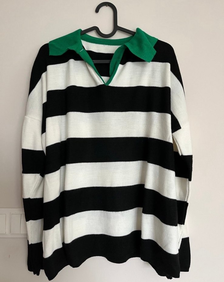 Uzun kollu, salaş kesim kadın kazak. Yeşil yakalı, siyah-beyaz çizgili ve sentetik kumaştan örülmüş rahat stil için uygun. 3xl 42 bedenden 50 bedene kadar olur