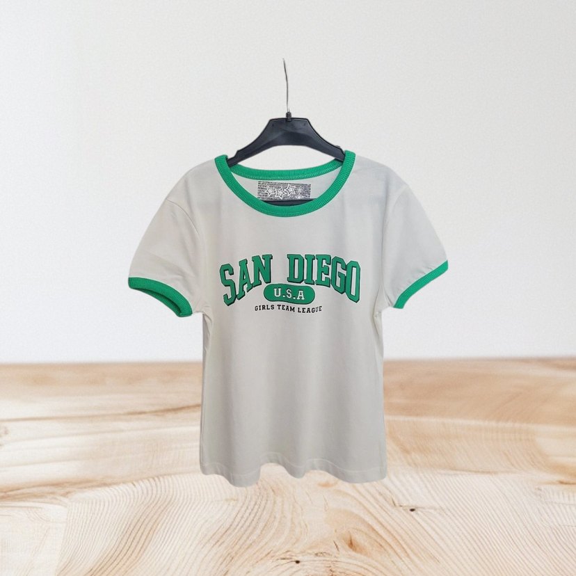 Yeşil yakalı, kısa kollu ve bol kesim mini tişört. Sentetik kumaştan, 'SAN DIEGO U.S.A' baskılı, spor ve rahat stil için uygundur.