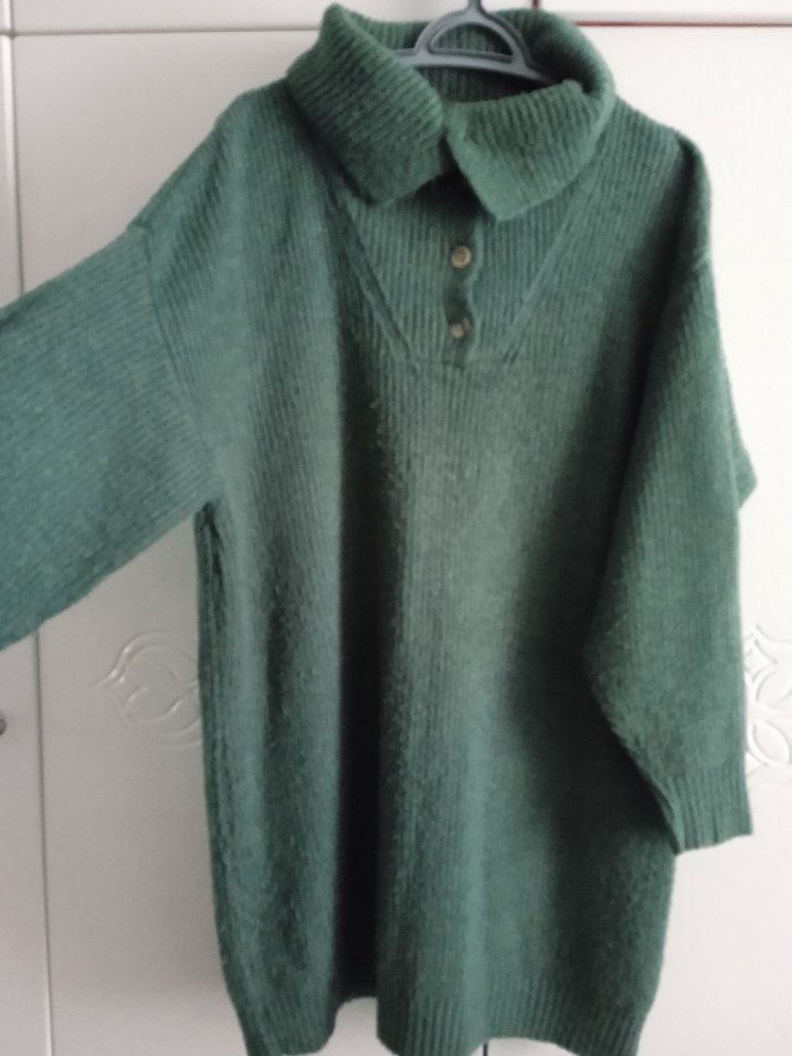 Yeşil renkli, yakalı ve uzun kollu örgü kadın kazak. Rahat, midi boy ve bol kesimdir. Yumuşak dokusu ile günlük kullanıma uygundur.