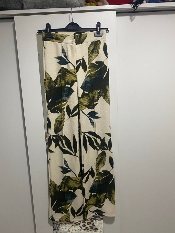 Kadınlar için uzun, yeşil baskılı kumaş pantolon, yumuşak sentetik kumaştan, drapeli ve slim kesimlidir. Etiketini çıkarmıştım ama hiç giyemedim