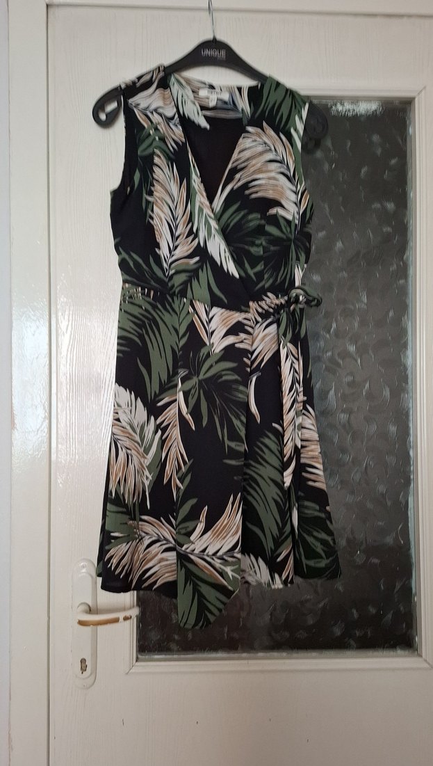 Yeşil yaprak desenli, kolsuz, V yakalı midi elbise, bol kesim ve drapeli tasarıma sahiptir. Hafif sentetik kumaştan üretilmiştir. İki kol arası 46 bel 38 boy 91 cm.