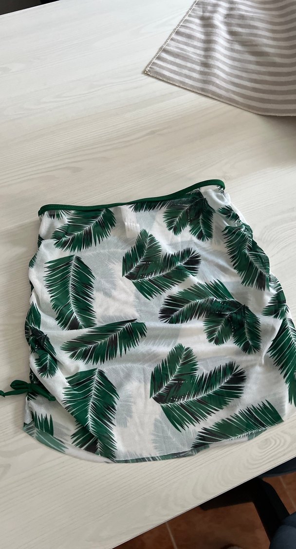 Yeşil yaprak desenli, dökümlü, bol kesim ve midi boy bohem pareo, plaj için uygun bir seçenektir.