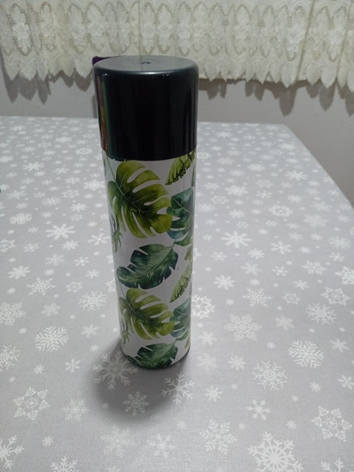 Siyah kapaklı, koyu yeşil yaprak desenli çocuk termosudur. İçecekleri sıcak veya soğuk tutar.