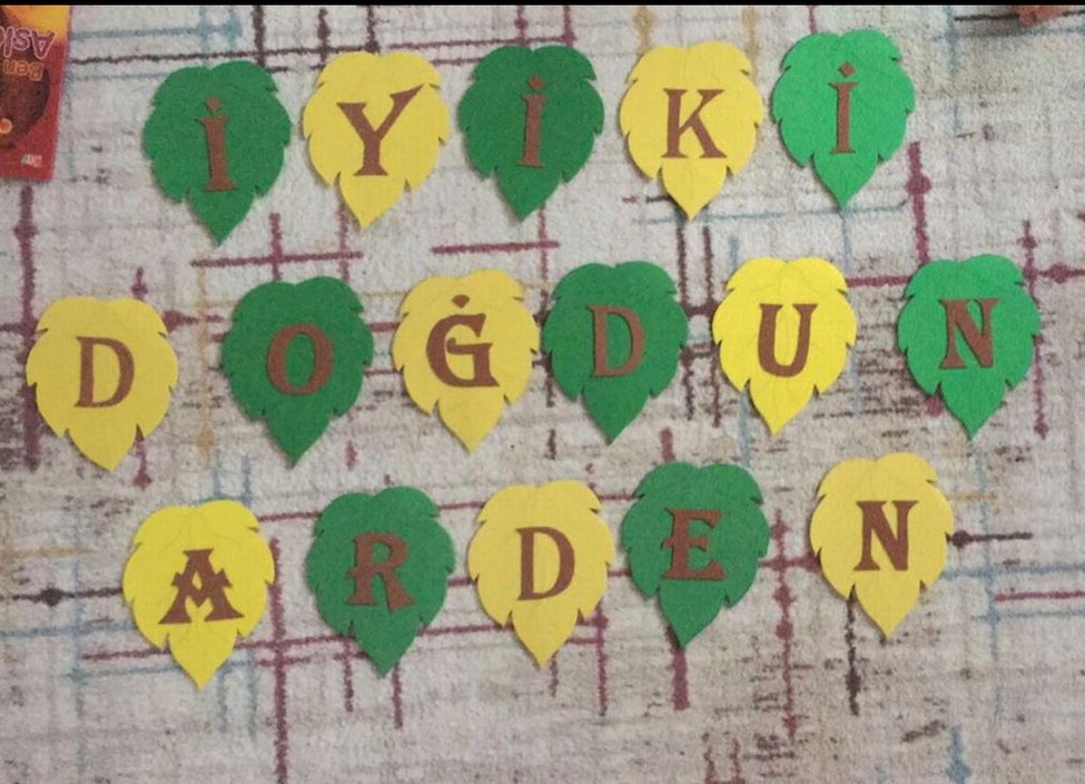 Yeşil ve sarı harf kesimlerinden oluşan renkli parti süsleme, kutlamalar için uygundur. Eva Kağıdından yapılmıştır istenilen renk ve şekillerden yapılır. El emeğidir. Yanında pasta üzerine eva ile isim de yazılır