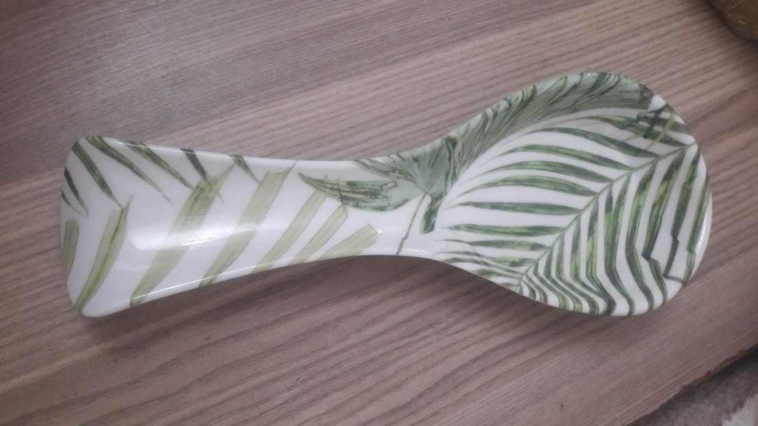 Yeşil yaprak desenli gri kaşık tutucu, kaşıkları yerinde tutar ve yüzeyleri temiz tutar.