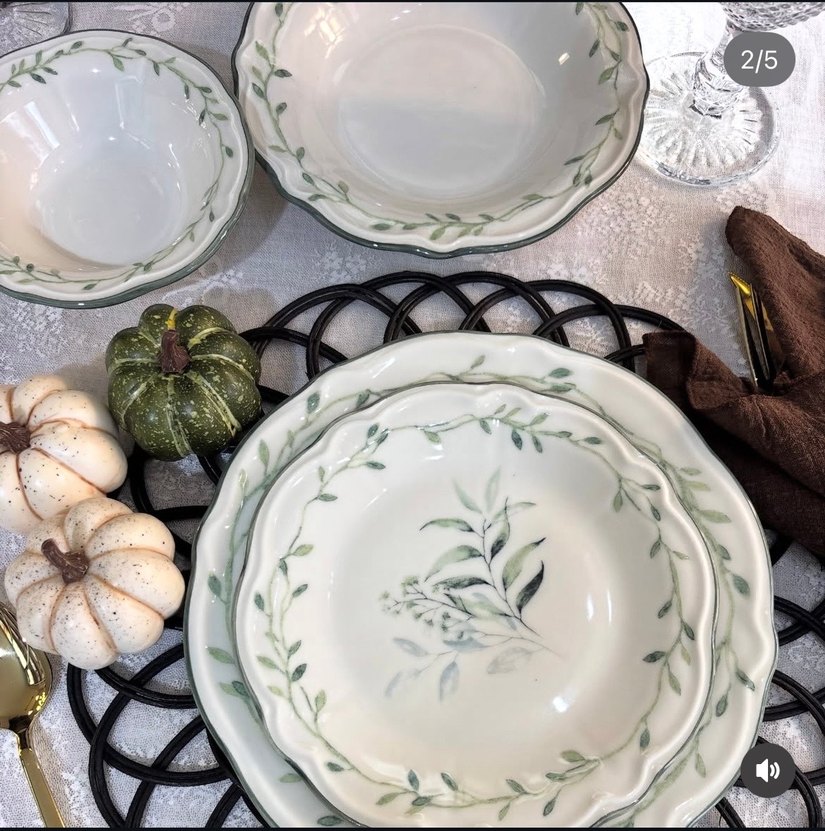Khaki zemin üzerinde yeşil yaprak desenli yemek kaseler, yiyecek sunumu için uygundur. 24 parça 6 kişilik tir