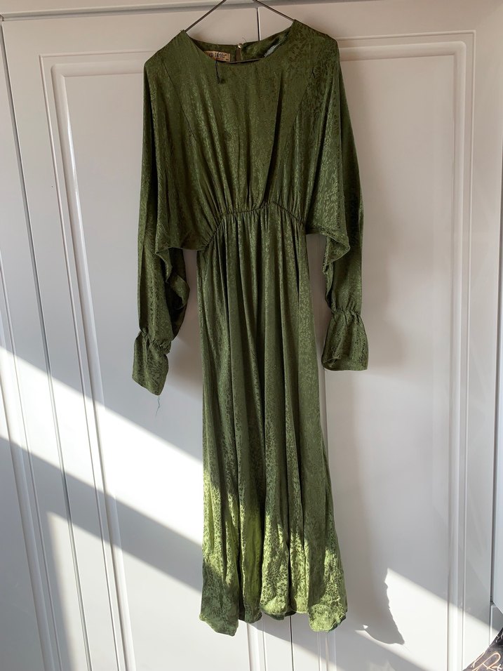 Parlak yeşil, uzun kollu ve salaş kesimli, drapeli detaylı, yuvarlak yakalı vintage bohem tarzı günlük elbise.