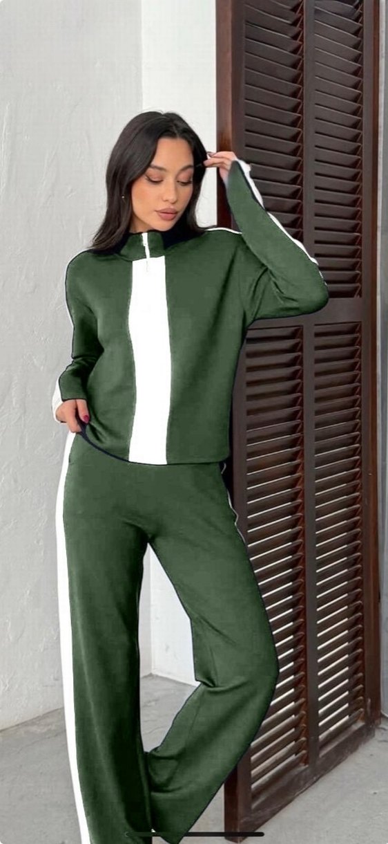Yarım fermuarlı, uzun kollu ve yüksek yakalı kadın eşofman takımı. Yeşil renkte, beyaz dikey şeritli, yumuşak ve rahat kumaştan üretilmiştir. Günlük kullanıma uygundur. ♀️