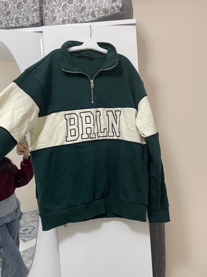 Yarım fermuarlı, yüksek yakalı, rahat kesim yeşil sweatshirt. Göğüs kısmında 'BRLN' baskısı bulunmaktadır. Yumuşak ve sıcak kumaştan üretilmiştir.