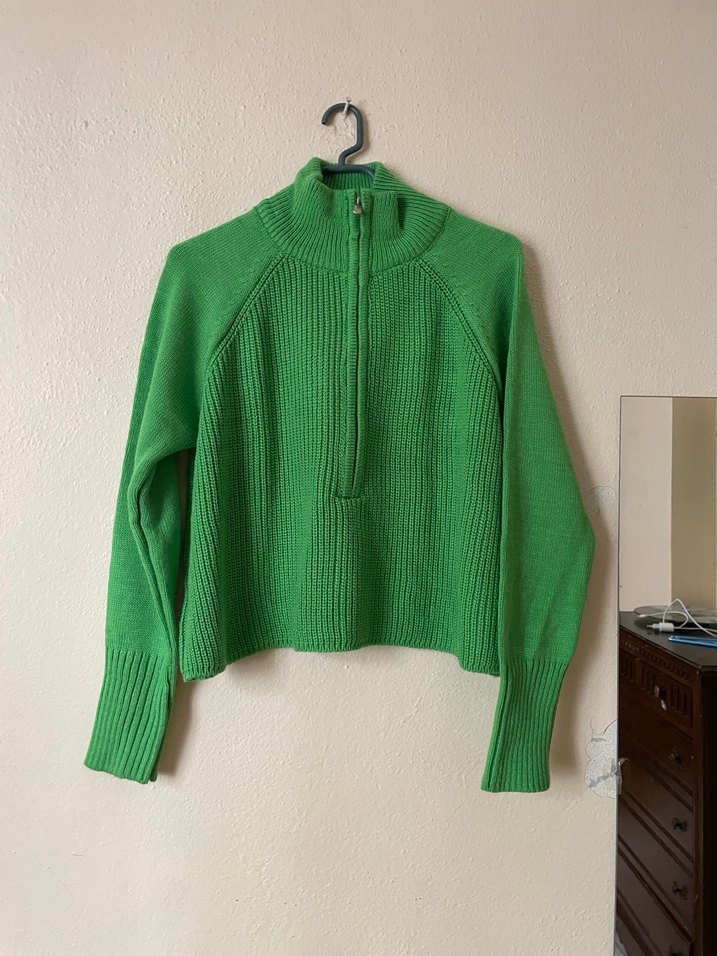 Yeşil renkli, yarım fermuarlı yüksek yakalı, uzun kollu ve vücuda oturan örgü kazak. Rahat ve orta boy tasarımıyla günlük sokak stiline uygun.