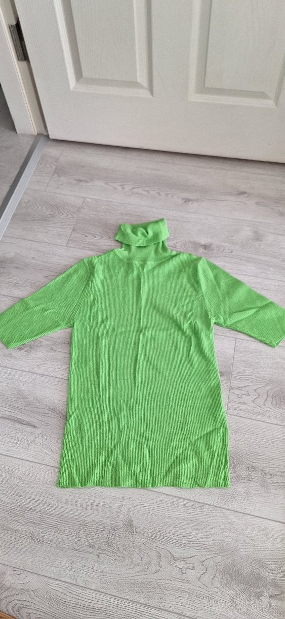 Yeşil renkli, balıkçı yaka ve yarım kollu, ince triko kumaştan yapılmış, rahat ve şık bir kazak.