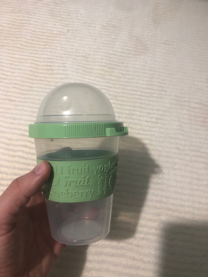 Yeşil pastel renkli silikon tutma yeri ve şeffaf gövdesi olan Yeberry kap, kubbe şeklinde kapaklıdır.
